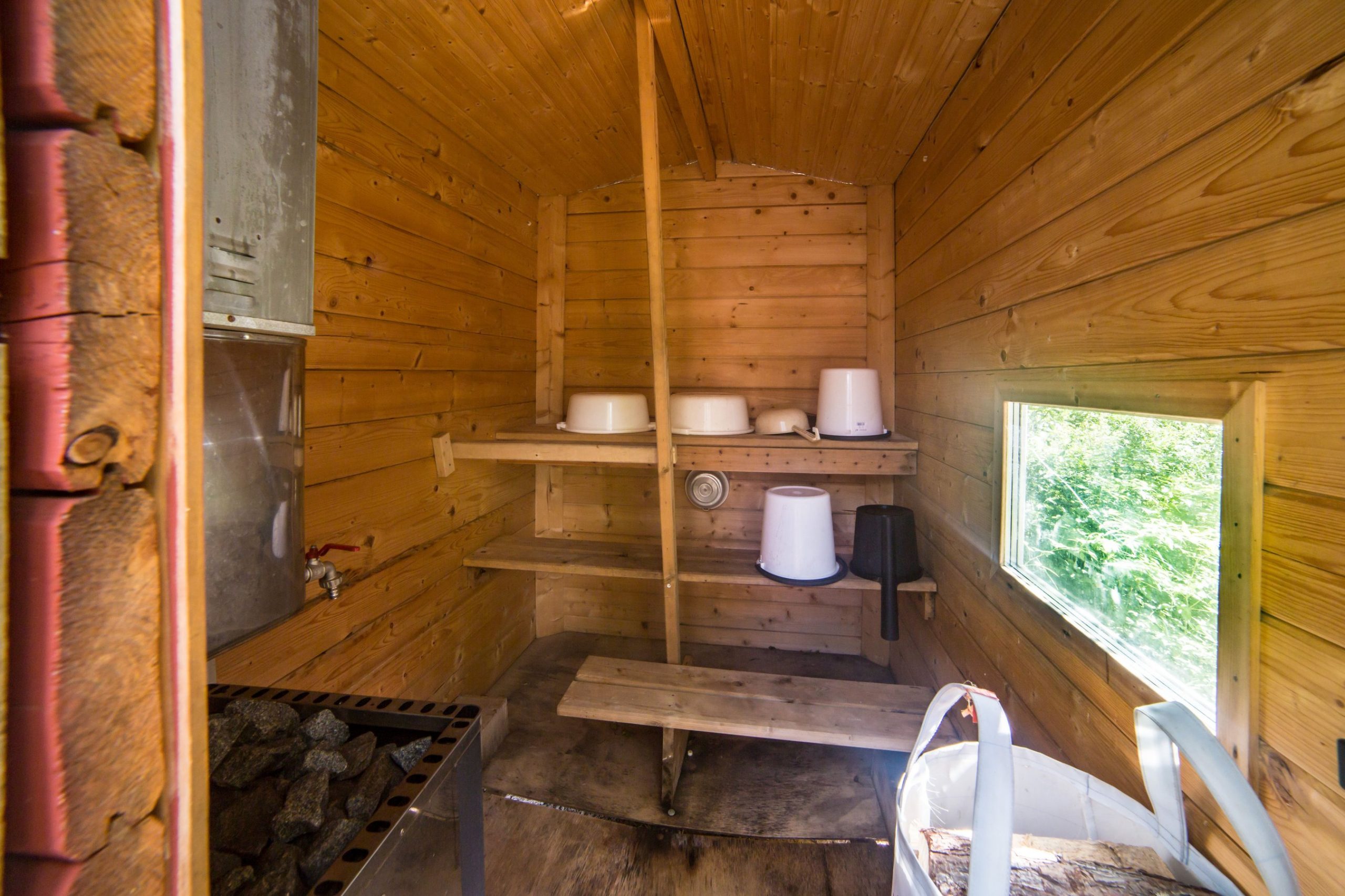 Mökissä on puulämmitteinen sauna, joka on rakennettu pienen peräkärryn päälle – erikoinen ja tunnelmallinen lisä saunanautintoon! Kiuas lämpiää puilla, ja vesi lämmitetään padassa. Saunalta johtavat portaat alas lammen rantaan, jossa voit vilvoitella löylyjen välissä.